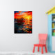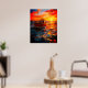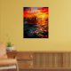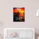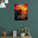 Cette affiche a un bateau au coucher du soleil dessus.