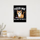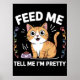 Ce graphique amusant présente un joyeux chat rayé orange et noir, assis avec impatience à côté d'un bol de nourriture violet, avec de grands yeux expressifs et un sourire ouvert. Le texte rose gras en haut indique "FEED ME", tandis que le texte blanc ci-dessous indique clairement "TELL ME I'M JOTTY", dépeignant avec humour les désirs d'un chat. Divers empreintes de pattes colorés encadrent le design, le tout contre un arrière - plan noir solide. Téléchargement numérique à usage personnel uniquement.