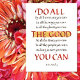 Un rappel doux mais fort à "Faites tout le bien que vous pouvez, par tous les moyens que vous pouvez; De toutes les façons que vous pouvez, Dans tous les endroits que vous pouvez, En tout temps vous pouvez, À tous les gens que vous pouvez, Aussi longtemps que vous le pouvez." Vous voulez changer votre monde ? Ça le fera !