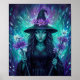 This mystical poster features a dark witch portrait with glowing blue eyes, purple flowers, and a spellbinding teal-purple aura in a surreal fantasy scene. Finished in a oil acrylic painterly style.