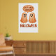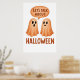 Deux fantômes de dessins animés avec des expressions différentes s'engagent dans une conversation. Au-dessus d'eux, une bulle de discours dit "Parlons d'Halloween".