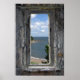 Regardez cette vue sur la plage de sable depuis votre propre fenêtre de château. La pierre d'âge encadre une vue sur la mer où les vagues s'écrasent sur le sable. Une petite tour au bout d'un mur de défense s'ouvre, formant une petite baie. Des nuages blancs flottants flottent au-dessus. C'est une scène merveilleuse pour quiconque aime les châteaux ou souhaite vivre au bord de la mer.