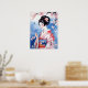 Poster dans le portrait d'une belle femme vêtue d'un kimono traditionnel tient délicatement un papillon bleu au milieu des fleurs de cerisiers en fleurs.