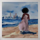 Aquarelle illustrant les femmes noires debout sur une plage qui contemple les gratte-ciel de San Francisco au loin.