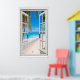 Fenêtre fausse vue sur l'océan. Plage et palmiers, pour un mur de bureaux sans fenêtres. Illusion d'optique réaliste et amusante affiche pittoresque pour un bureau ou un mur d'étude.