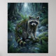 A curious fern raccoon explores a mossy woodland trail where playful spirit meets botanical beauty. Realistic raccoon anatomy blends with layered fern fronds, bark textures, soft fur, and leafy green accents across the shoulders, mask, tail, and back. Fallen logs, mushrooms, forest mist, filtered sunlight, and winding paths create a magical nature setting full of charm. This whimsical fantasy wildlife design adds personality to nurseries, cabins, offices, or gift collections. Perfect for raccoon lovers, forest decor fans, and rustic woodland themes.