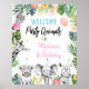 Bienvenue à vos invités de fête avec une adorable enseigne personnalisée. Encadrez le panneau et affichez-le sur une table près de l'entrée ou montez l'affiche en mousse et montez-le à l'extérieur sur un chevalet. Le design comprend des animaux de safari aquarelle avec des feuilles d'or et des confettis.