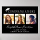 Affiche moderne de fête de fin d'études noire avec "FÉLICITATIONS" en blanc et une illustration d'une casquette de fin d'études blanche sur le dessus, un collage de trois photos, son nom dans un script blanc élégant, et son année de classe et le nom de son école en typographie blanche simple. Les couleurs de l'arrière-plan et de la typographie peuvent être modifiées selon les couleurs de votre école en sélectionnant "éditer dans l'outil de conception".