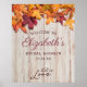 Tombez amoureux de ce panneau de fête de mariage sur le thème de l'automne. Ce panneau comporte un fond en bois rustique blanc avec des feuilles colorées en rouge, orange et jaune.