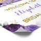Panneau de bienvenue sur le thème du voyage pour une fête de mariage, une baby shower, un mariage, etc. avec des fleurs violettes à l'aquarelle élégantes, des valises vintage et un globe lavande