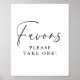 Cette Elégante Fête des mariées manuscrite Favors Poster dispose d'une élégante conception manuscrite en noir et blanc qui dit "Favors" dans une police propre et sophistiquée. Faites une déclaration à votre douche nuptiale avec cette enseigne chic qui dirige les invités vers la table ou la zone de faveur. Le design simple et élégant donne le ton à un événement moderne et élégant. Placez cette affiche dans un cadre et accrochez-la au mur ou au chevalet, ou appuyez-la sur la table des faveurs. La palette minimaliste noir et blanc fonctionne avec n'importe quelle palette de couleurs de douche nuptiale. Ce panneau de faveur est idéal pour la mariée qui cherche à ajouter des touches simples et élégantes à son décor de douche nuptiale. La conception manuscrite ajoute une touche personnelle et intime. Surprenez et enchantez vos invités avec cette belle affiche qui élève votre douche nuptiale au niveau de sophistication supérieur.
