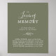 Cette affiche minimale de feuille vert foncé en mémoire affectueuse est parfaite pour un mariage élégant. Le design présente une silhouette de feuille de verdure simple en vert olive avec un style bohème montagnard minimaliste.