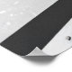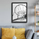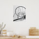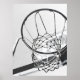 Une photographie dynamique en noir et blanc prise sous un panier de basketball, capturant le filet et l'anneau sur un ciel lumineux. La perspective audacieuse vers le haut crée une atmosphère énergique et ambitieuse parfaite pour la chambre d'un joueur de basketball, un espace de détente pour adolescents ou une salle de jeux.