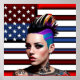 Mohawk punk rocker femme avec mohawk coloré, tatouages et piercings et American Flag à l'arrière d'elle.