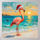 Portrait fantaisiste d'un flamand fin, sa forme élégante illustrée de roses douces et délicates et de blancs crémeux, se tenant gracieusement sur une plage ensoleillée. Perché sur la tête est un chapeau de Santa clair et festif, son velours rouge et sa fourrure blanche, un contraste saisissant avec les plumes de l'oiseau. L'arrière - plan se fond doucement dans les teintes chaudes et dorées d'un soleil couchant, reflétant sur des eaux turquoise calmes et peu profondes, illustrées de coups de pinceau lâche et impressionniste qui évoquent un sentiment de joie de vacances sereine.