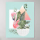 Poster au style unique et aux allures tropicales, ce design présente un flamant rose aquarelle gracieux mélangé à des formes géométriques en pois et des textures dégradées ombres. Le feuillage tropical est éparpillé dans tout le design pour ajouter de la couleur et du contraste sur un arrière - plan pastel aqua bleu-vert. Ajoutez une touche de fantaisie tropicale côtière à votre décor avec ce design élégant.