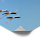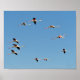 Flamingos in flight (Phoenicopterus ruber) on the blue sky background, in the Camargue is a natural located south of Arles, France, between the Mediterranean Sea and the two arms of the Rhône delta