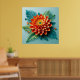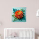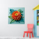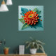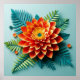 Fleur de papier, brillante et finement façonnée, avec des pétales orange vif et jaunes au coeur turquoise.