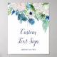 Ce panneau de texte personnalisé avec des fleurs blanches classiques est parfait pour un événement printanier. Le design floral élégant présente des roses, des pivoines et des chrysanthèmes de couleur ivoire et blanche, avec des touches de fleurs de couleur bleu pervenche à l'aquarelle et du feuillage vert. Personnalisez le texte pour dire tout ce que vous voulez ! Ce panneau peut être utilisé pour les cartes et les cadeaux, le livre d'or, le hashtag de mariage, les faveurs, le bar à desserts - tout ! Il peut être utilisé pour un mariage, une douche de mariée, un dîner de répétition ou tout événement. La ligne de texte en bas du panneau peut être personnalisée avec la date ou un court message comme "Merci". Si vous souhaitez plusieurs panneaux coordonnés, personnalisez et ajoutez-les à votre panier un à la fois.