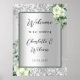 Un arrière - plan à l'aspect faux argenté, décoré de confettis et de fleurs blanches. Avec le texte : Bienvenue à notre mariage. Personnalisez et ajoutez vos noms.