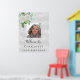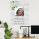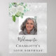 Une affiche de bienvenue pour une fête d'anniversaire de 50e (ou tout âge). Personnalisez et ajoutez une photo, un nom et un âge. Un faux arrière - plan argenté et poussière de parties scintillant, décoré de fleurs blanches, roses et verdure. Dos : pas de design.