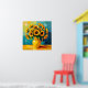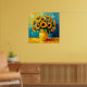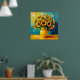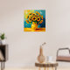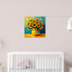 Poster avec une magnifique illustration d'un tournesol jaune dans un joli vase jaune fait dans un style impasto et un arrière - plan turquoise ou turquoise.