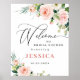 Accueillez vos invités à votre mariage avec l'Affiche Fleurs Roses Élégantes Boho Baby Shower, avec une verdure botanique aquarelle luxuriante et des fleurs blanches, avec "bienvenue dans notre bonheur éternel", vos noms et date du mariage dans un mélange chic de typographies modernes et de calligraphie manuscrite.