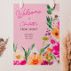 Bienvenue à vos invités dans le style avec notre Elegant brillant et audacieux modèle de fleurs d'été de printemps moderne avec fleur sauvage assez surdimensionnée et script de brosse signe de douche nuptiale avec une typographie de calligraphie moderne avec des fleurs lumineuses rose néon, orange, vert et jaune sur le rose pastel rétro.