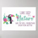 Cette affiche inspirante présente une belle empreinte tropicale aux couleurs vives, avec un mignon dessin animé toucan, des feuilles et des fleurs tropicaux colorés, et un petit oiseau rose. La légende, d'Einstein, dit : "regarde profondément dans la Nature et tu comprendras tout mieux", en polices violette et bleu clair.