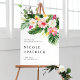 Bienvenue aux invités à votre événement avec ce panneau d'accueil wedding shower personnalisable. Il présente des illustrations d'aquarelle de la végétation tropicale et des fleurs comme l'hibiscus et la plumeria. Personnalisez en ajoutant vos détails. Cette enseigne tropicale wedding shower est parfaite pour les mariages d'été.