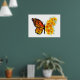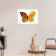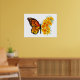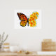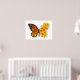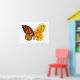 Orange, detailed monarch butterfly with wing decorated with yellow, vibrant California poppy on white background.
