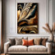 Plongez dans l'opulence avec cette œuvre abstraite hypnotique. Des vagues de métal liquide en or, bronze et argent glissent de manière organique sur un fond noir profond. Des textures rappelant la soie et les plumes apportent du dynamisme. Idéal pour la décoration haut de gamme et l'image de marque premium.