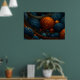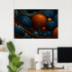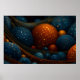 Une oeuvre digitale fascinante avec des sphères bleues et oranges brillantes nichées au milieu de structures tourbillonnantes, en forme de ruban. La composition évoque un univers fantastique ou un monde microscopique, riche en texture et en profondeur. Parfait pour les amateurs d'art abstrait, de thèmes cosmiques et de narration visuelle vibrante.