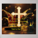 Grande croix dorée avec casquette de jester et couronne dorée avec design typographique.
