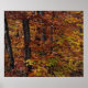 Cette affiche présente un design impressionniste d'une forêt de hêtres aux couleurs d'automne brillantes de rouge, brun, jaune et or. Quelques troncs marron foncé regardent à travers les feuille.