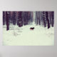 Affiche Forêt de pins enneigée d'hiver, chien marchant dan