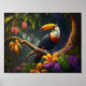 Toucan illustré dans les branches d'arbres entourées de fleurs tropicales vibrantes dans une forêt tropicale humide.