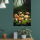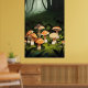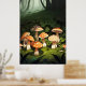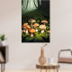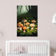 Un ensemble de champignons oranges et blancs aux taches blanches se dresse dans une forêt verdoyante. Les champignons sont disposés en demi-cercle, avec leurs casquettes inclinés vers le spectateur. Le sol de la forêt est recouvert d'une moquette de feuilles verts et de mousse, avec de grands arbres foncés qui apparaissent dans l'arrière - plan. L'air est épais de brume, créant un sentiment de mystère et d'enchantement.