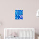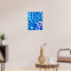 Affiche dans une illustration semi-abstraite d'une forêt fantastique avec des fleurs, du feuillage, des arbres et des oiseaux, dans des nuances de bleu cobalt et de blanc