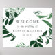 Bienvenue dans votre mariage avec notre affiche Wild Forest, avec une bordure géométrique de verdure vert de forêt riche, feuillage et feuilles botaniques, avec "bienvenue à notre mariage", vos noms, et date mariage dans un mélange chic de serif moderne et de caractères italiques.