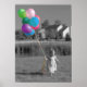 Image nostalgique d'une petite fille en train de courir au jeu avec un bouquet de ballons. Noir et blanc avec coloration sélective.