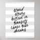 Un morceau inspirant de décoration murale moderne qui dit : "Tenez bon, croyez en vous, poursuivez vos rêves" dans un texte audacieux, écrit à la main et cursif. Un rappel quotidien pour aller en confiance dans la direction du désir de votre coeur et être fidèle à vous-même. Texte contemporain audacieusement imprimé en noir avec typographie fantaisiste sur un arrière - plan motif rayé gris et blanc tendance pour une décoration parfaitement neutre.