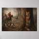 A fox hides behind a tree while a group of hunters on horseback pursue it with a pack of hounds in a forest setting. The scene captures tension and the natural instincts of survival.
