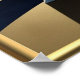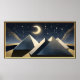 Pyramides stylisées, géométriques, lune de croissant, constellations d'étoiles, or muet, teintes navy.