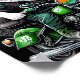 Un ami en fureur derrière les guidons d'une moto verte brillante, portant une tenue verte de la Saint Patrick qui fait tourner la tête. Le chien est habillé d'un ensemble festif, avec une cravate arc-en-ciel verte et un chapeau haut assorti qui se trouve doucement au-dessus de la tête. Le costume présente des motifs complexes de shamrocks et de leprechauns, ce qui indique clairement que ce chien est prêt à célébrer la Saint Patrick avec style.