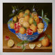 Une vie morte d'un bol bleu et blanc avec des fruits sur une table. Le fruit est des oranges avec quelques feuilles vertes.