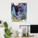 Magical water color illustration of a reindeer with sleigh in a forest with Christmas trees, covered with snow and lit by the light of the full moon in the starry sky.
