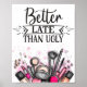 Affiche amusante et ironique pour les amateurs de maquillage, avec la légende "Mieux vaut tard que moche", en typographie moderne noire, ornée d'une belle illustration de produits cosmétiques. Pour des demandes personnalisées, d'autres personnalisations ou des combinaisons de couleurs, n'hésitez pas à me contacter à l'adresse zolicestore@hotmail.com