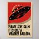 This funny retro propaganda poster features a stark black flying saucer hovering over a red and beige background. The bold, impactful text reads, "PLEASE STAY CALM. IT IS ONLY A WEATHER BALLOON," satirizing classic government attempts to explain away UFO sightings. This design is perfect for those who love conspiracy theories, vintage sci-fi, political satire, and bold, nostalgic graphic design.