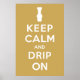 Une version de la célèbre affiche de l'effort de la Seconde Guerre mondiale, "Keep calm and carry", dédiée aux vapeurs qui aiment dériver. Le slogan est Keep Calm and Drip On, il comporte une pointe goutte sur le dessus et la couleur est dorée. Vape-toi, goutte-à-goutte et sois inspiré, Amateurs de piqûres !